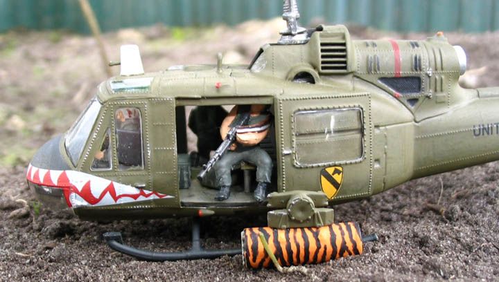 Mit seinem prägnanten Haifisch-Maul ist dieser Huey natürlich ein echter Hingucker. Ich fand bei meinen Recherchen allerdings einige Ungenauigkieten bei der im Bausatz dargestellten Version und dem Vorbild (Original hat zwei und nicht nur einen Streifen auf dem Heckausleger), aber da ich ja eh meine eigene "Kilgore-Staffel" aufbaue, ist das egal gewesen.