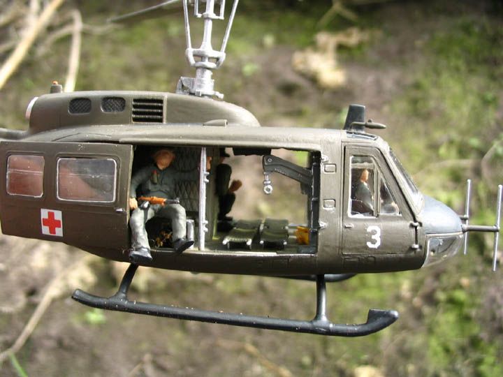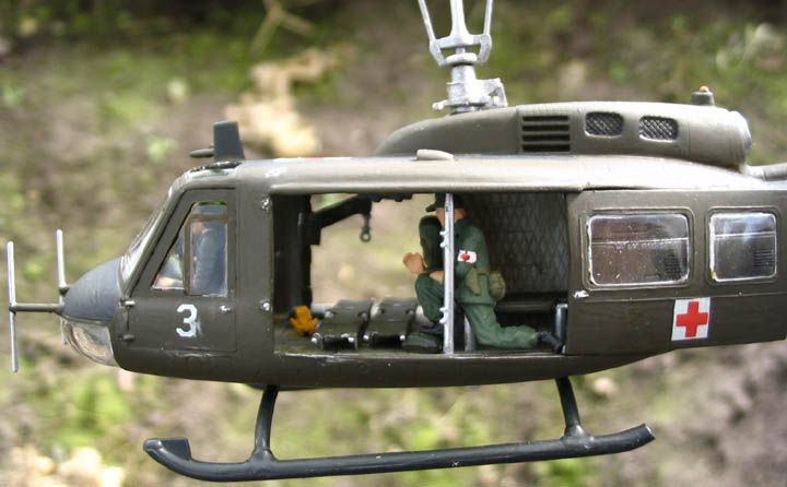 Der DustOff entstand aus dem D-Huey von Italeri, dazu waren nur wenige Umbauarbeiten nötig: Die kleinen Laderaumtüren wurden herausgesäbelt, die Innenbänke weggelassen und stattdessen zwei Tragbahren eingebaut.