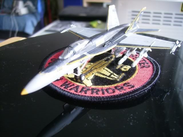 Eine F-18C von Revell in 1:144..leider in einem Farbschema an dem ich fast verzweifelt bin- ein gleichmäßig dünner gelber Streifen auf schwarzem Untergrund....