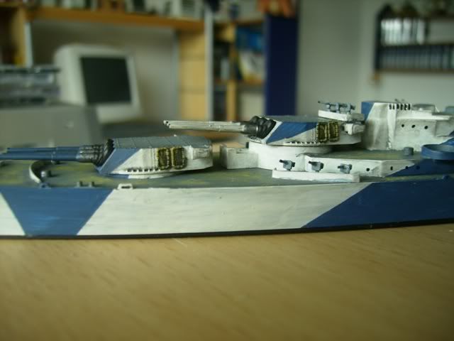 Die Iowa freut sich inzwischen über die Hauptartillerie, die 12,7cm Mehrzweckgeschütze und den Großteil der Fla..hoff ich bekomm sie Ostern fertig damit langsam mal Bewegung in das Hafenprojekt kommt (8 von 23 Schiffen sind momentan fertig, und die Hafenanlage und das Flugfeld gehören auch noch gebaut)