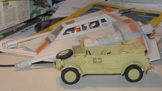 Gute Frage Achim! Mangels vorliegenden Abmessungen kann ich eigentlich nur mit einem Vergleich dienen. Tamiya VW Kübelwagen 1:35 (vor langem gebaut, Altlast) im Größenvergleich mit dem Snowspeeder. Ich würde sagen - paßt. Jetzt noch ein paar 1:35ger Rentiere und der Weihnachtsmann kann seinen Schlitten upgraden ;-)
