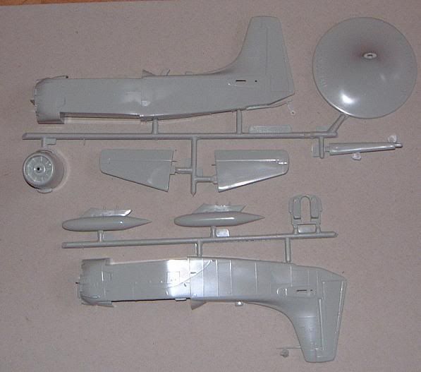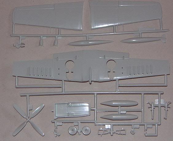Revell hat hier eine wahre Antiquität in eine neue Schachtel gepackt. Der Bausatz ist ursprünglich von Monogram aus dem Jahre 1967 und hatte somit letztes Jahr beim Erscheinen schon 40 Jahre auf der Form. Erstaunlicherweise sieht man die Jahre dem Bausatz weit weniger an als vermutet. Alle etwas über 30 Teile sind glatt und sauber in hellgrauen Spritzguß gefertigt, hier und da ein wenig Grat, aber sonst ohne Fehler. Natürlich muß man hier Abstriche in Sachen Detailliertheit machen und mit erhabenen Gravuren leben. Besonders das Cockpit ist sehr rustikal ausgeführt, hier gab es jedoch von einem kleinen amerikanischen Hersteller ein Resinersatzteil, welches aber nur noch sehr schwer zu beziehen sein dürfte. Standardmäßig sind alle Teile in einer Plastiktüte verpackt, das einzige Klarsichtteil, die große Cockpithaube, hat nochmal eine Extratüte. Die Haube hat allerdings am Rand leichte Kratzspuren und Einschlüsse von den Auswerfermarken auf dem Rand. Ersatz bietet hier bei Bedarf eine Vakuhaube von Falcon. Auswerfermarken müssen sonst nur von den Höhenrudern entfernt werden, dort sollte man auch das erhaben aufgeprägte Copyright wegschleifen.