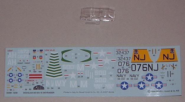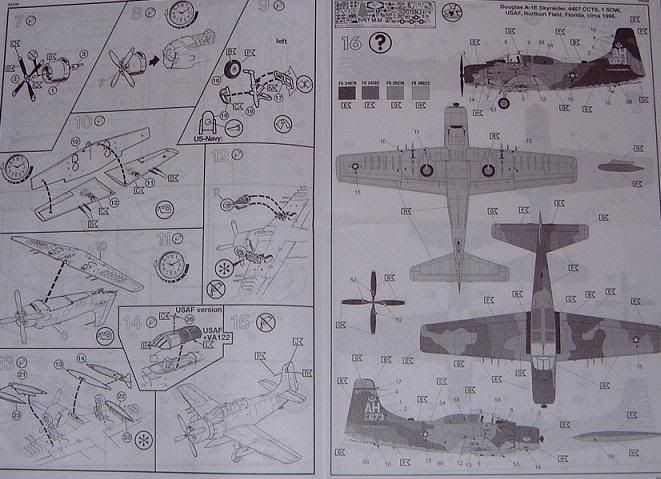 Highlight des Bausatzes ist jedoch eindeutig der große Decalbogen, welcher 3 recht farbenfrohe Hi-Vis-Skyraider in verschiedenen Varianten bauen läßt:
