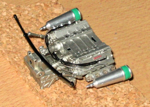 Als erstes hab ich mir mal den Motorblock gegriffen, der Block mit einer Mischung als Vallejo Old Gold und Aquacolor Alu, die Ansaugrohre mit dem Tamiya Silber Marker, dazu noch ein paar Kabel gezogen, da war mein 1:12 126C2 ein gutes Vorbild.