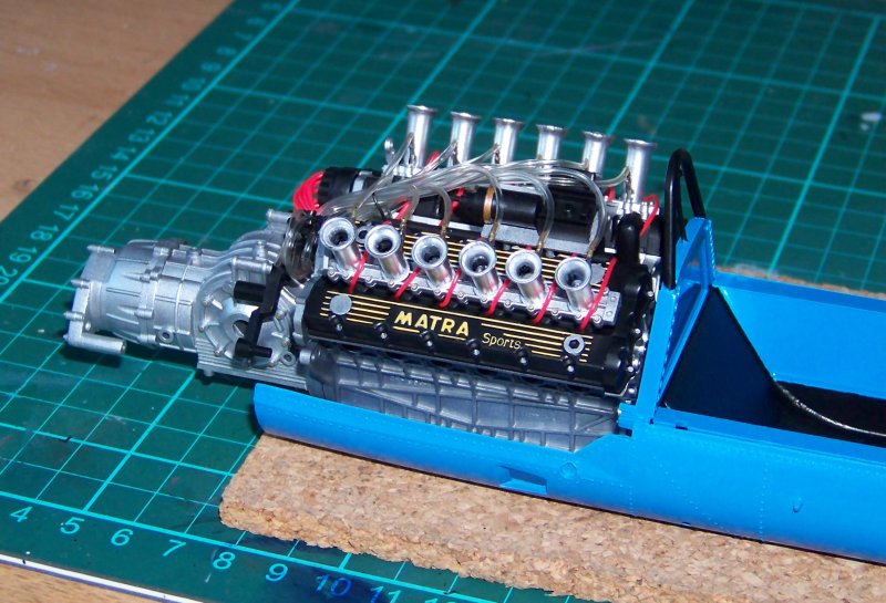 Bausatz: der alte Matra MS11 von 1968, ein 40 Jahre alter Kit - aber zum Glück sind die Decals neuer. Hoffentlich kommt mal ne Wiederauflage, dann bestell ich mir beim Ersatzteilservice den Motor einzeln und stell ihn dann daneben hin, der sieht lecker.