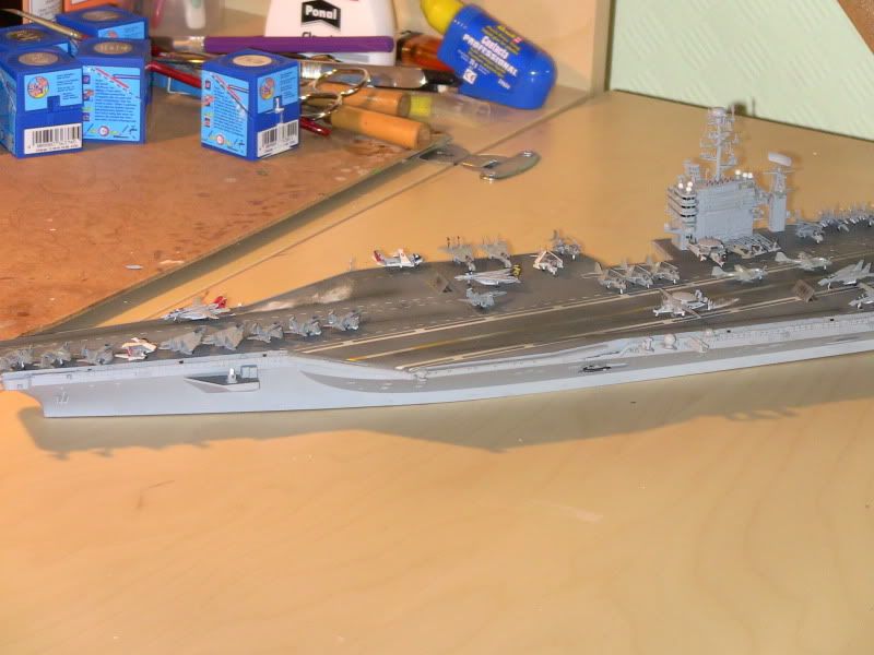 Zuerst ein Blick auf den jetzt - bis auf die noch fehlenden Sea Sparrow-Starter - fertigen Flugzeugträger. Die Insel und den Radarmast habe ich allerdings noch nicht fest montiert, zu groß ist meine Angst, beim Arbeiten am Modell diese filigranen Mastkonstruktionen abzureissen. Der Radarmast wäre als Ätzteil bestimmt besser gewesen, so in Plastik sind die Gitterkonstruktionen zu grob.