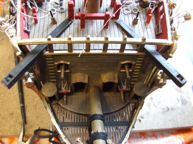 Die Ösen neben den Booten hatte ich in einer ersten Version laut Heller Takelplan mit laufendem Gut belegt, mittlerweile habe ich diese Taue aber an logischeren Punkten angeschlagen und die Augbolzen sind jetzt frei für die Boote.