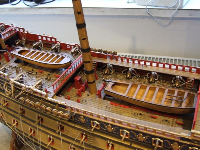 Zu den Booten gabs ja schon Hinweise was man noch machen könnte. Ich möchte hinzufügen das ein wenig mehr Farbe den Booten auch gut tun würde. Möglich wäre vielleicht den Unterwasserrumpf anzustreichen, ebenso das Innenleben und ein wenig Farbe am oberen Rand würde einem Flaggschiff wie der S.R. auch gut stehen. Ich kenne mich bei den älteren Franzosen nicht so aus aber zumindest Boote des 18. Jahrhunderts und später hatten teilweise recht bunte Anstriche. Das diente u.a der Unterscheidung zwischen gleichen Bootstypen, roter Kutter grüner Kutter usw.
