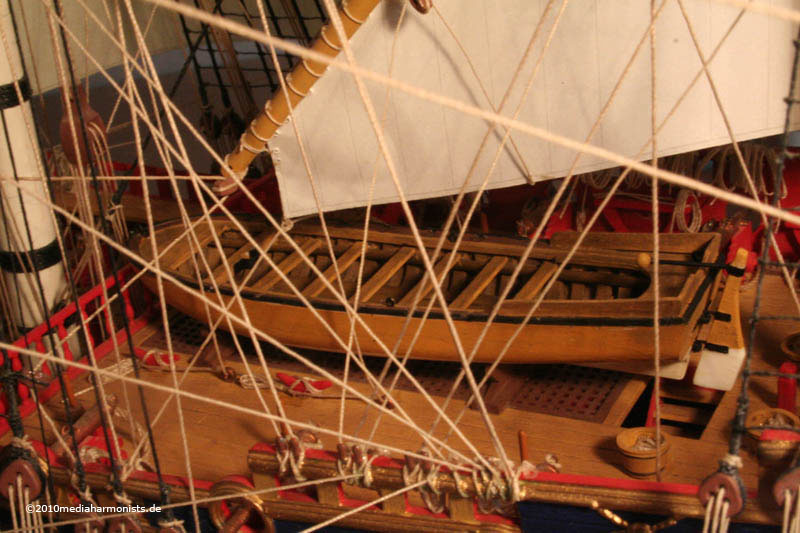 Was mich auch wundert, sind die vorgegebenen Ösen für die Verzurrung der beiden Beiboote: sind diese Ösen (4Stk.pro Boot) nun zum festzurren, oder für die Takelage zu verwenden(so wie bei deinem Modell)?"