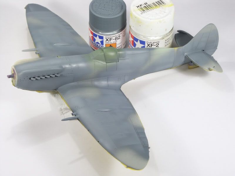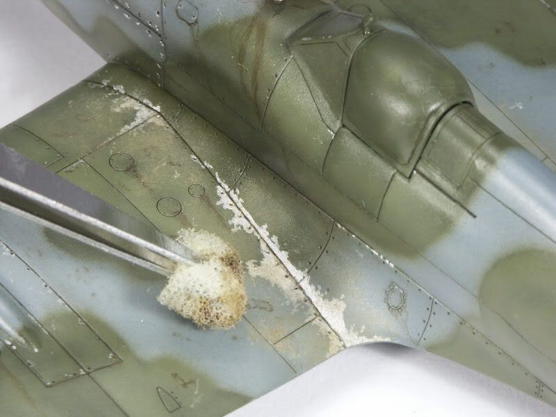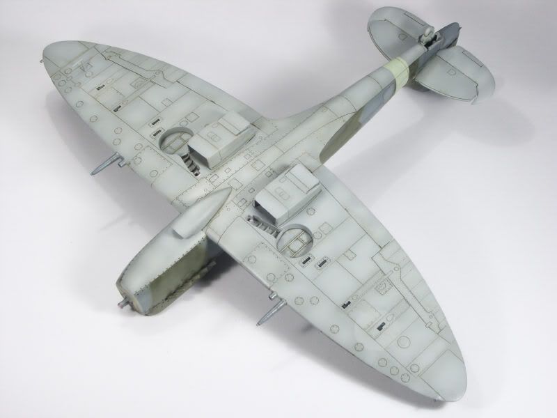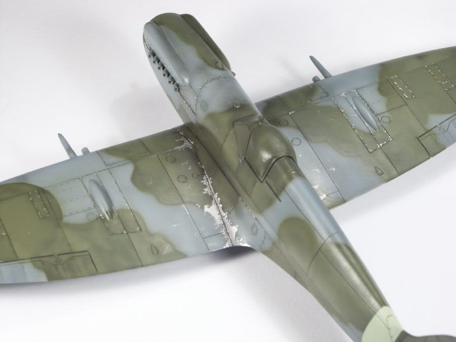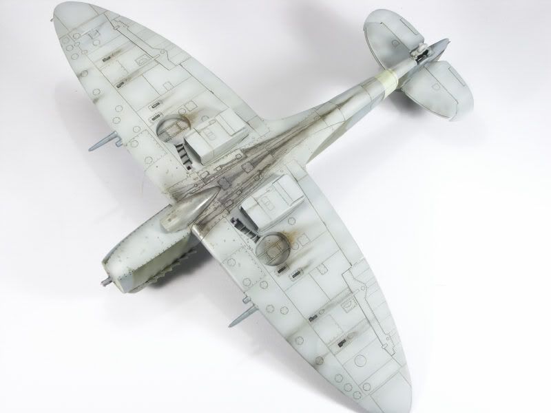 Danach folgte ein ganz typisches Spitfire-Merkmal, nämlich die bei Einsatzmaschinen schon nach kurzer Zeit extrem mit Öl- und Russschlieren verdreckte Unterseite des Mittelrumpfs. Dazu grundierte ich diesen Bereich zunächst streifig mit Tamiya-Smoke vor - nicht mit schwarz, wie hier zu sehen :2:.