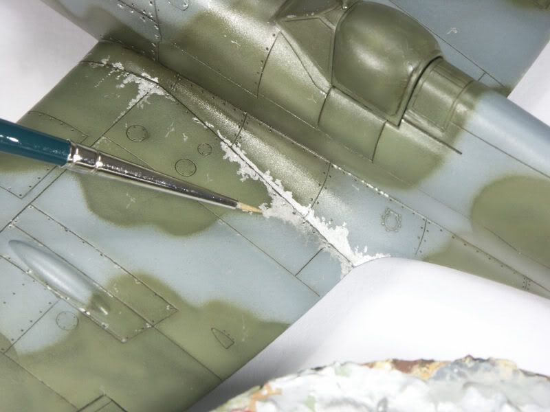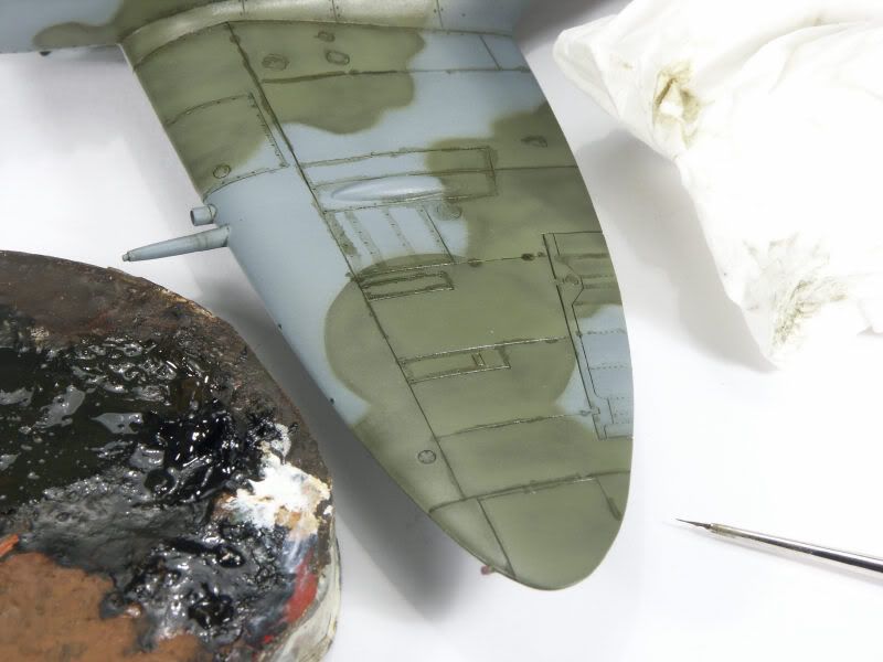 Mittlerweile (bei meinem letzten Modell    ;) ) gehe ich da etwas anders vor. Nach eine Behandlung der Oberfläche mit Klöarlack (Future) bringe ich  die Ölfarbmischung recht großzügig in die Panellines ein und kümmere mich nicht allzu sehr um Überschuß. Das Ganze lasse ich dann ca. ´ne Stunde in Ruhe und wische dann mit Wattestäbchen über die Oberfläche. Die Farbe bleibt in den Panellines und gleichzeitig lässt sich die Oberfläche vernünftig säubern. Natürlich kann man so auch ein wenig  steuern und dort und da ein wenig mehr Farbe stehen lassen oder wegnehmen. Prinzipiell ist es auch eine gute Idee in der Richtuing des Luftstroms zu wischen....