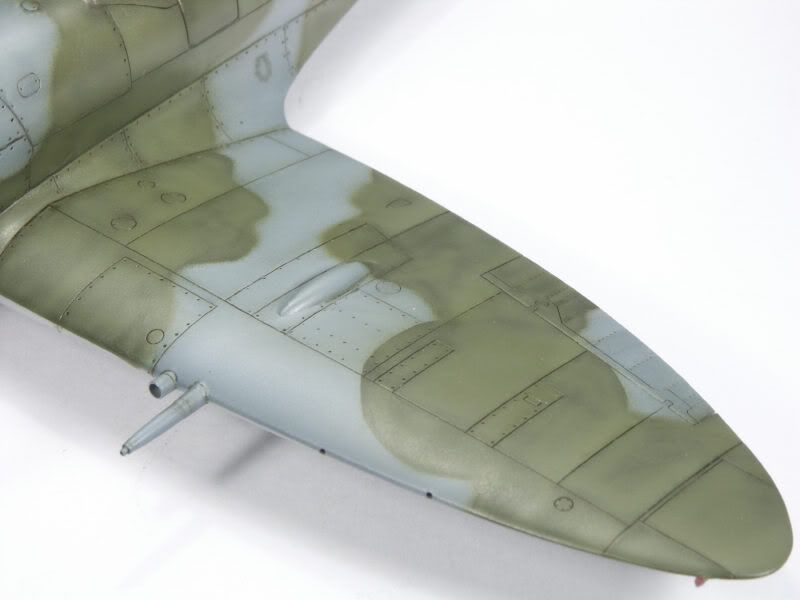 Um das Ganze ein wenig lebendiger zu gestalten, bzw. um erste Alterungsspuren zu simulieren, hellte ich das Dark Green mit Sky auf. Diese Mischung wurde nun in einem zweiten Lackiergang vorsichtig wolckig auf die grünen Tarnfelder gesprüht. Dann folgte eine weitere Aufhellung mit Sky, mit der mit Hilfe einer an einzelne Panelllinien aufgelegte Papierschablone noch mal ein paar "Lichter" gesetzt wurden.