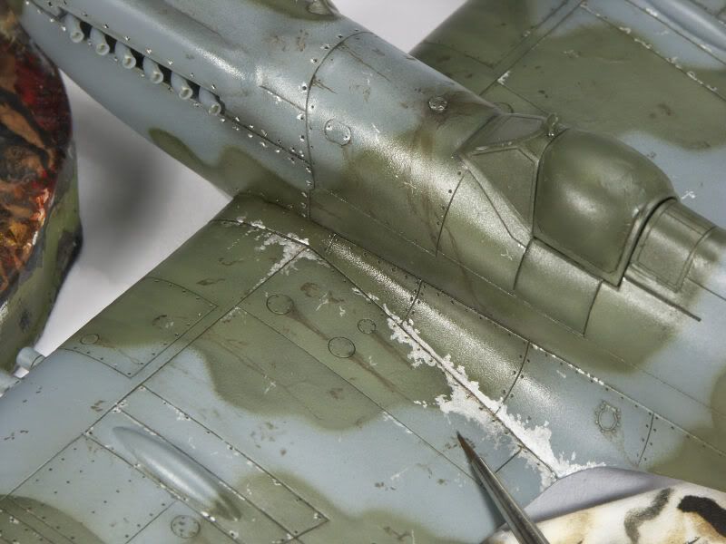 Dazu wurde zuerst an typischen Stellen, der bei Einsatzmaschinen übliche Farbabrieb dargestellt. Originalfotos zeigen sehr anschaulich, dass dieser bei der Spitfire häufig ganz besonders an den seitlich von Cockpit und Motorverkleidung liegenden Trittflächen auf der Tragfläche ausgeprägt war. Nun zeigte das entsprechende Referenzfoto der YB-A hier zwar noch keine solche Spuren, da ich aber mein Modell in einem späteren Einsatzstadium zeigen wollte, habe ich das Vorhandensein des Farbabriebs einfach unterstellt. Andere Maschinen der No.17 Sqn. aus diese Zeit zeigen auf Fotos jedenfalls entsprechende Verwitterungsspuren.