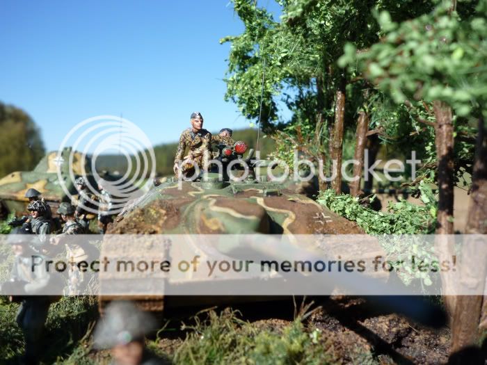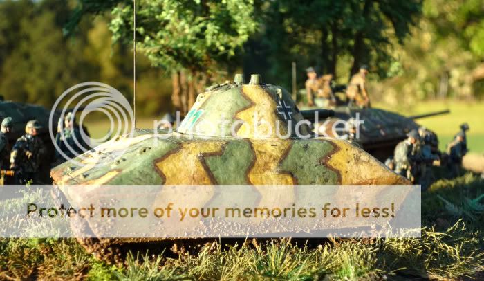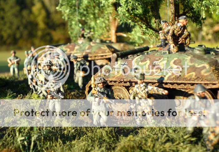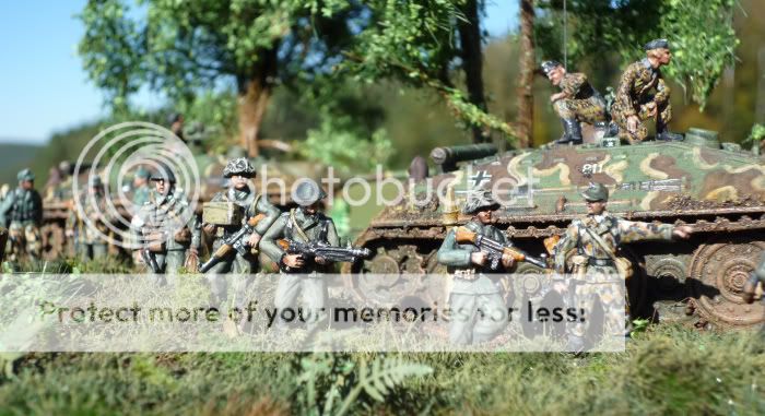 Hätte der Krieg nicht im Mai 1945 geendet, hätte so vielleicht eine deutsche Kampfgruppe ein paar Monate später ausgesehen. Eine gemischte Kampfgruppe aus neuen Rekruten und altgedienten Veteranen, unterstützt von zwei E25 Jagdpanzern und einem Jaguarundi-Flakpanzer mit 30mm-Kanone.