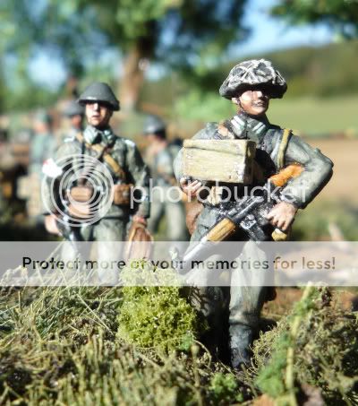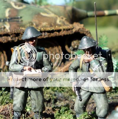 Die Felduniform 44 meint ihr. Die wurde dem britischen battle dress nachempfunden. Manche der Figuren tragen auch diese kurzen Jacken, z. B. der Kamerad mit der Haftladung und der MP40, der hinter dem Panzer steht oder die zwei Figuren mit den MG-Munikästen.
