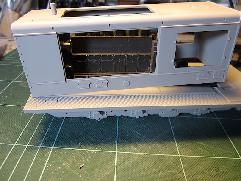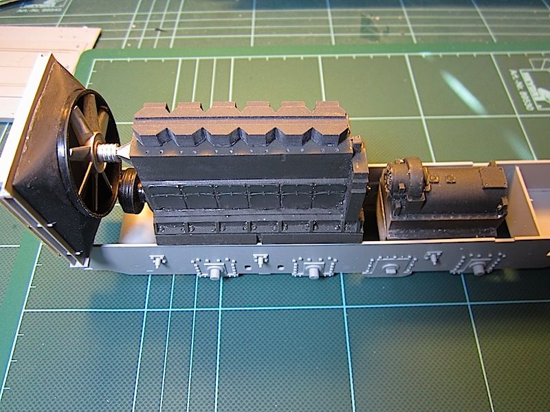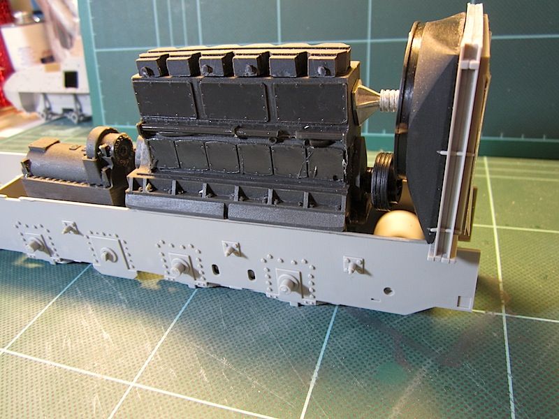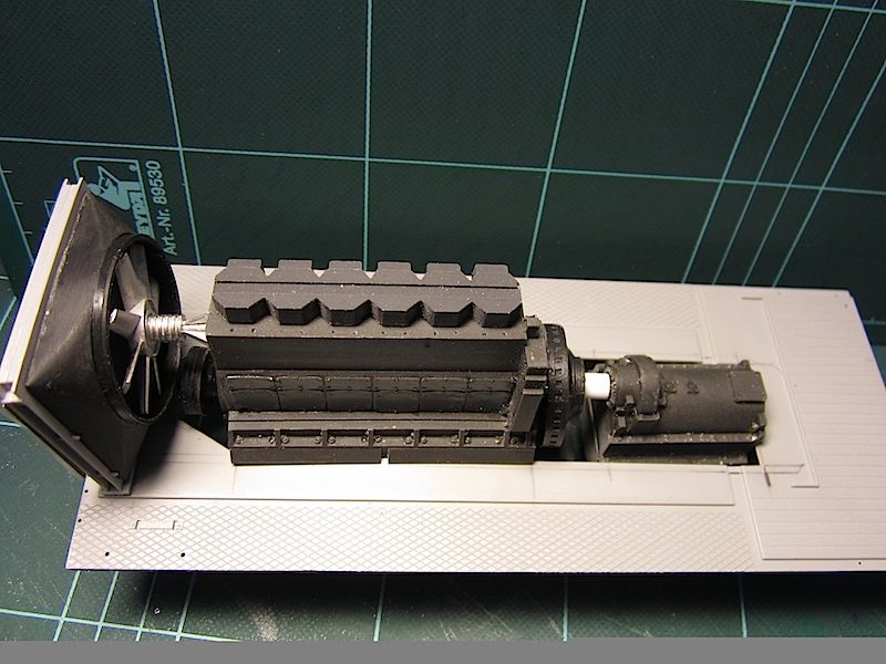 Die kleine Diesellok hat mich schon immer fasziniert; Trumpeter hat zwar "nur" die WR360C12 als Modell auf den Markt gebracht - die mit 10 Exemplaren seriemmäßig weit hinter der WR360C14 zurückblieb - aber irgendwie knuffig ist die schon. Nur die großen Schiebetüren und dann nix dahinter schien mir dann doch zu langweilig. Hier die erste Stellprobe von Kühler mit Lüfter, Motörchen (immerhin 6 Zylinder mit 98l Hubraum) und Getriebe: