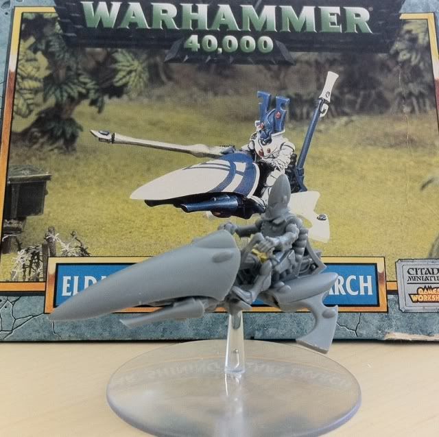 In der Mittagspause wurde der Eldar samt Gleiter dann schnell zusammengebaut, die Weißmetall Figur habe ich nicht verarbeitet, u.a. weil ich erst nach Montage des Lenkers feststellte, das die Weißmetalfigur des Eldars selbst einen Lenker angegossen hatte.