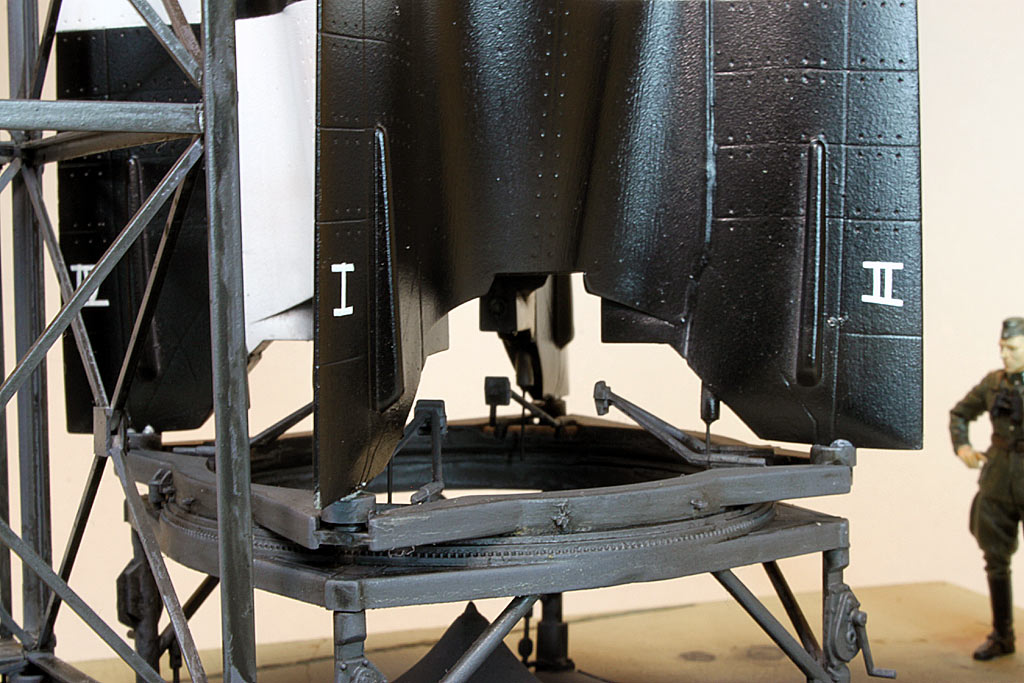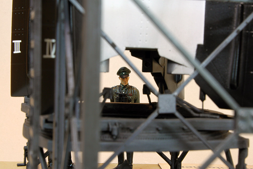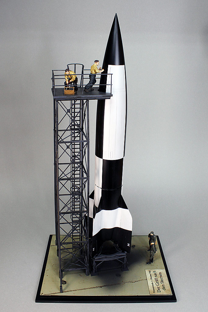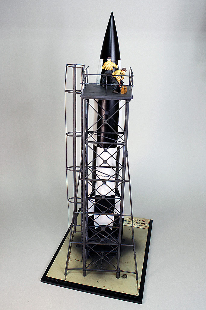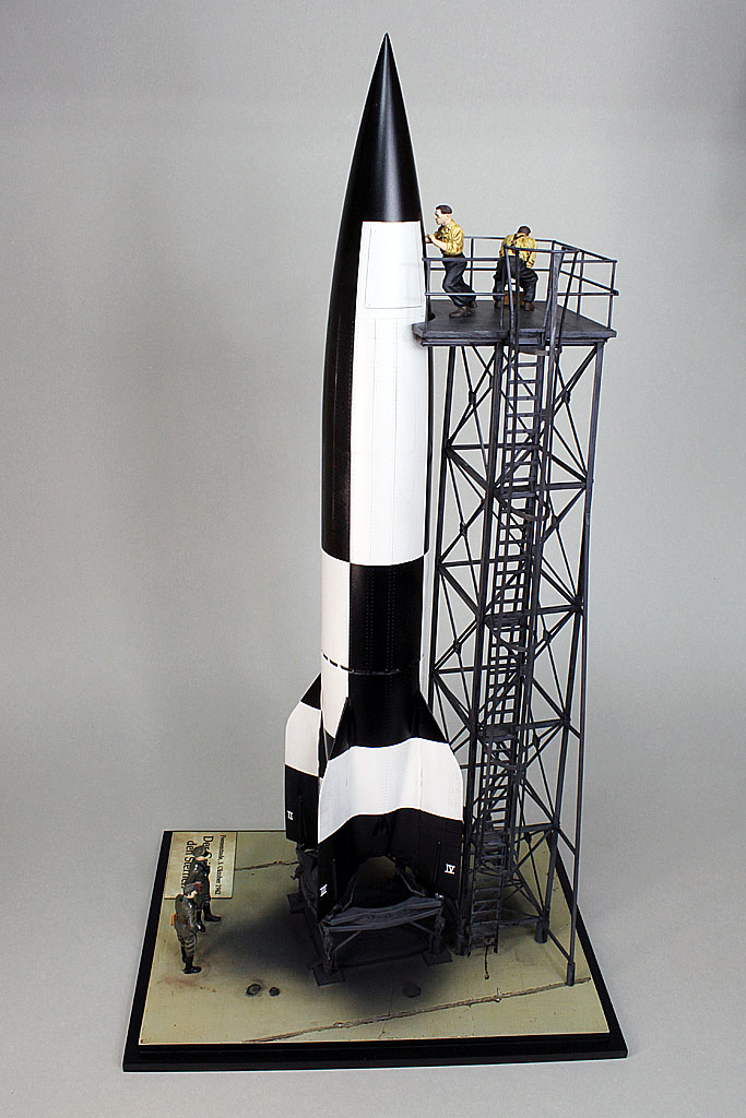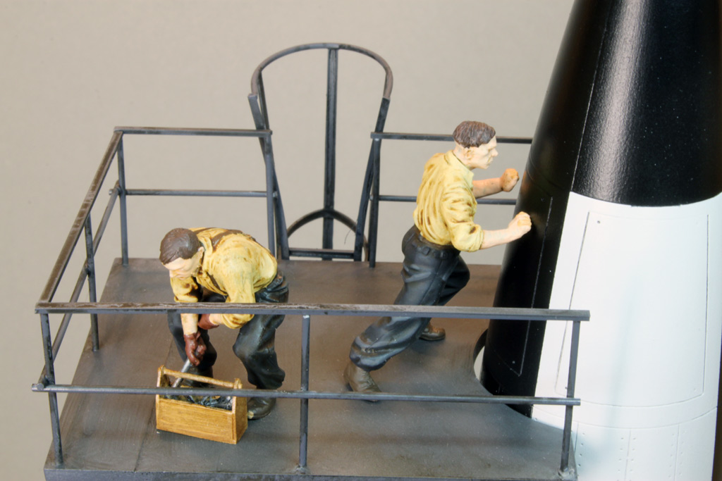 Die Figuren stammen aus dem Dragon-Set "German Command Staff" (Nr. 6213) und von MiniArt "German Tank repair crew" (Nr. 35011). Das Wartungsgerüst entstand aus Profilen und Sheet. Es hat nur eine grobe Ähnlichkeit mit dem Gerüst auf dem Prüfstand VII in Peenemünde, allerdings war es nicht so leicht hier Aussagekräftiges Bildmaterial zu finden. Scheinbar ist auch öfters mal ein neues Gerüst aufgestellt worden, wenn man sich die verschiedenen Bilder anschaut, also habe ich einfach frei interpretiert.