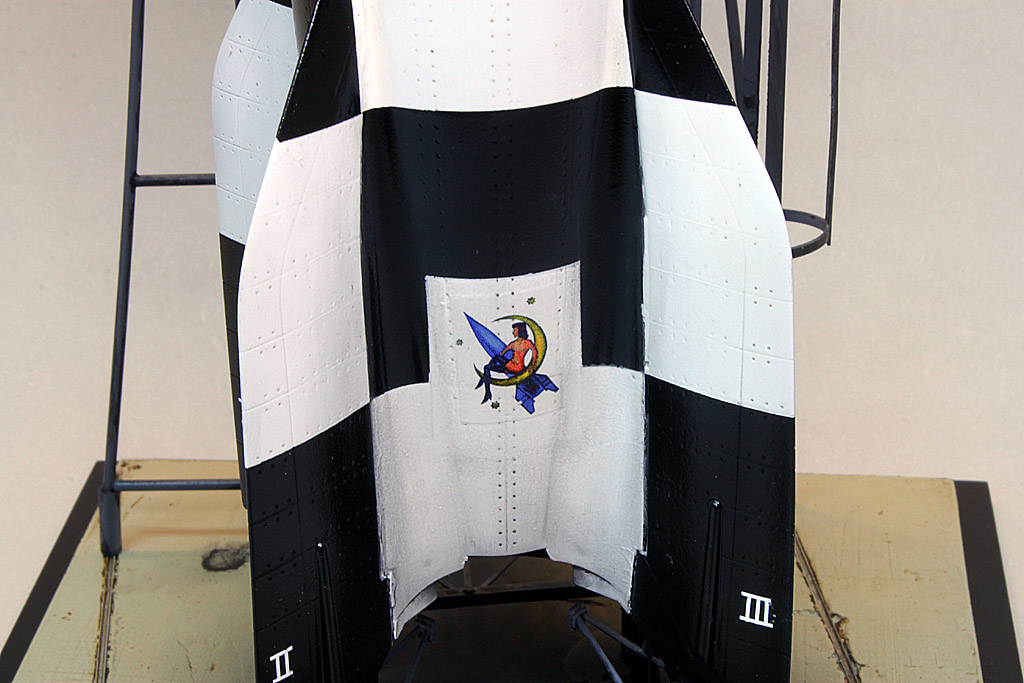 Mich wundert bei dieser Zielgeraden-Odyssee ja schon, dass das Decal der Frau im Mond geworden ist. Das habe ich auf Decalfolie von RaiRo gedruckt (HP Deskjet 990Cxi) und mit Microscale Decalfilm versiegelt.