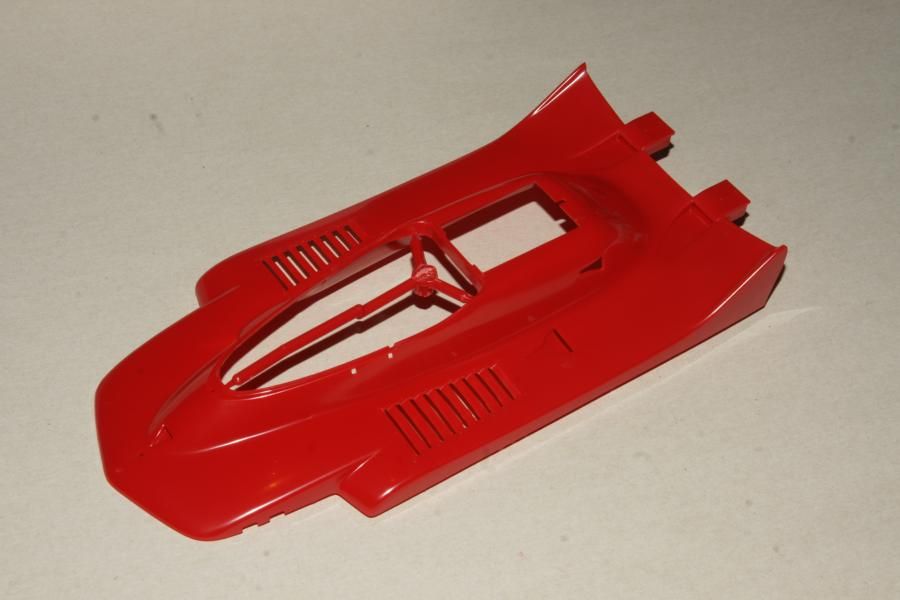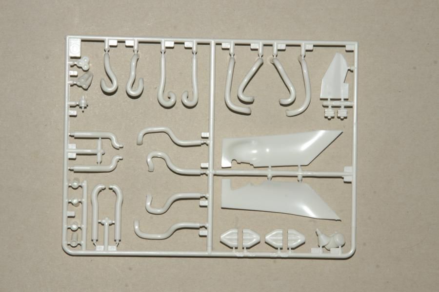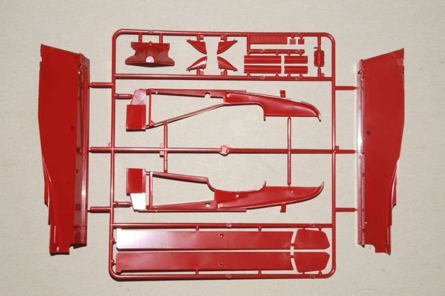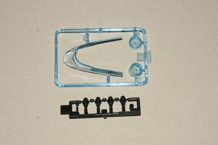 Die Schachtel enthält 8 Gussäste sowie Chassis und Karosserie in rotem, weißem, grauem, schwarzem und klarblauem Plastik.