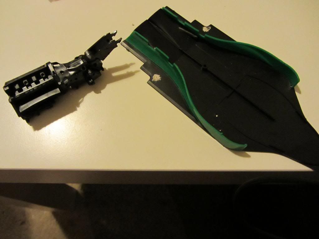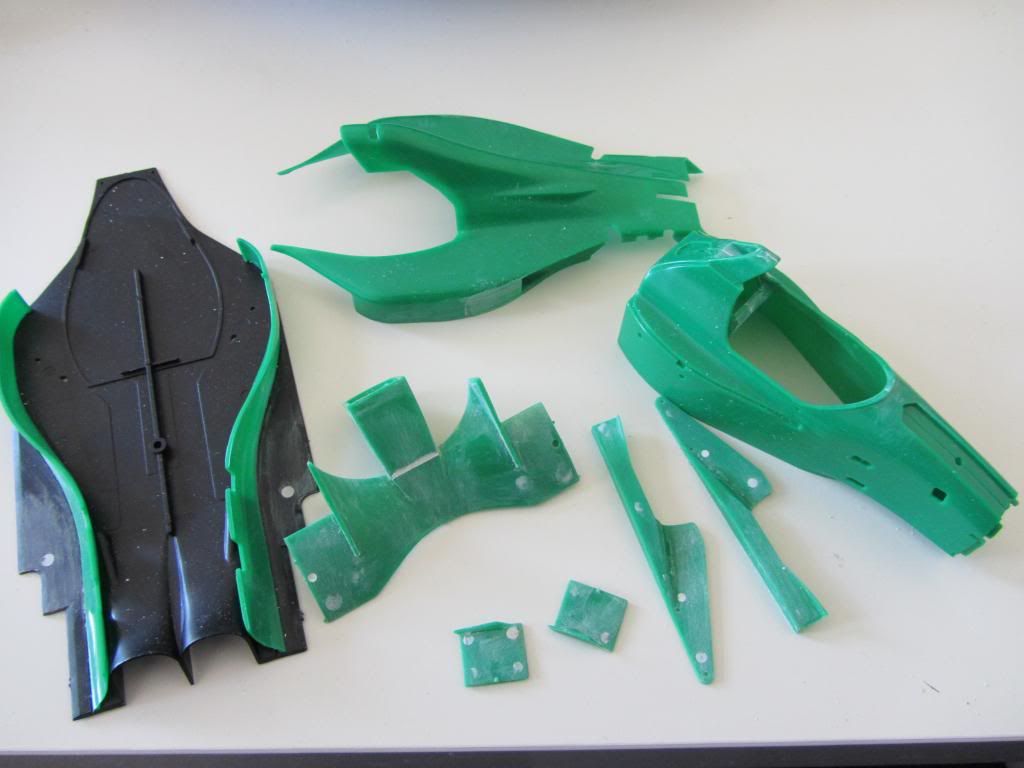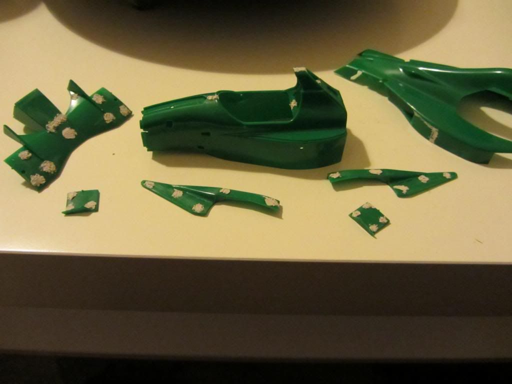 Hab das Monocoque und die Nase, und die Seitenteile der Motorabdeckung zusammen und angeklebt und verspachtelt. Das selbe am Unterboden und die Motor-Getriebe-Einheit zusammengeklebt. Nichts Spannendes. Jetzt wird geschliffen.
