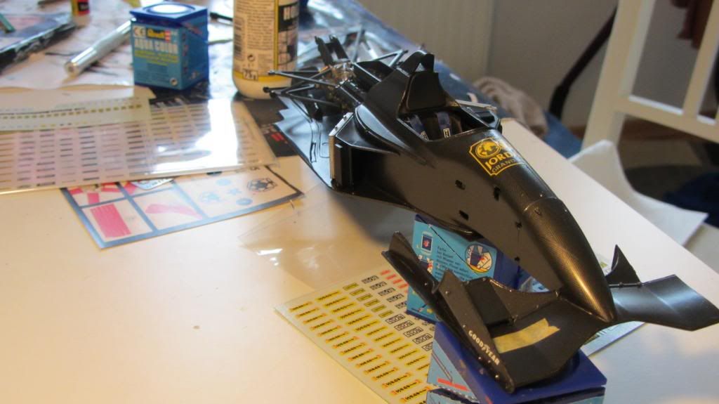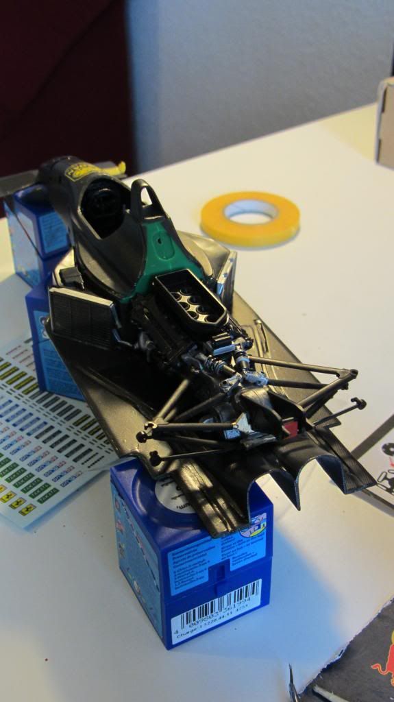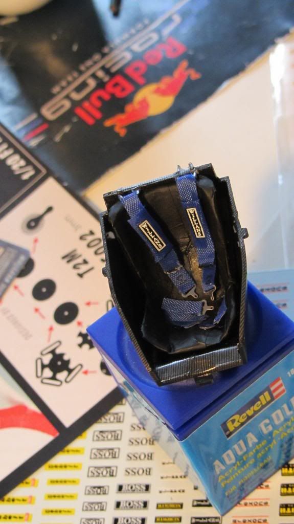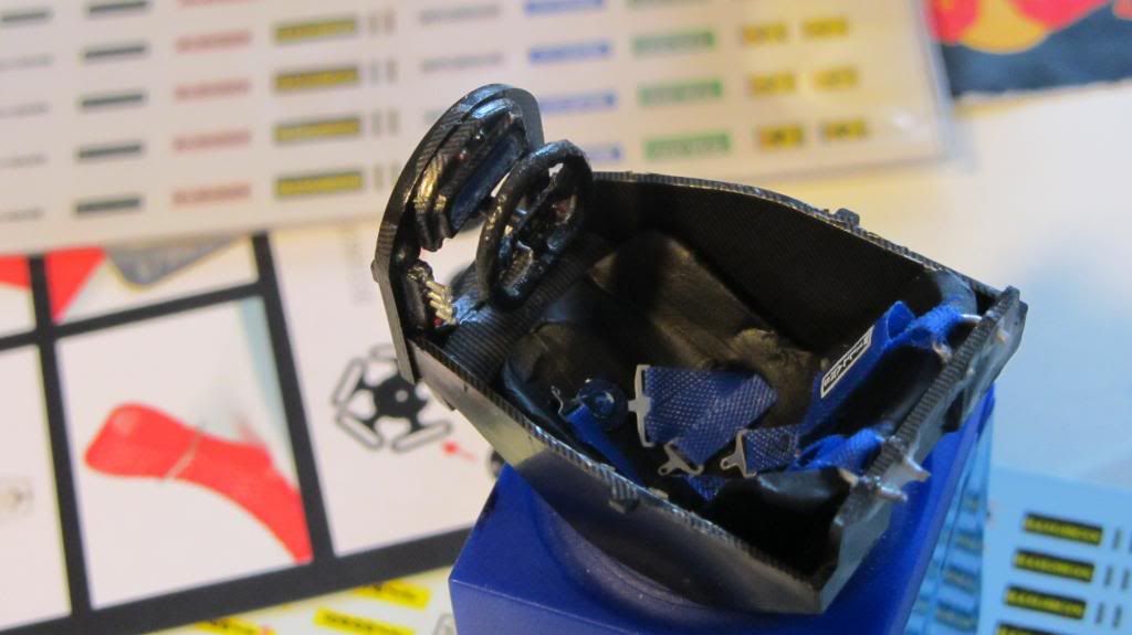 Es ging weiter. Die angegossenen Gurte wurden entfernt und mit Tamiya Tape beklebt. Außerdem wurden 2 Löcher in die Sitzseiten geschliffen, durch die nachher die seitlichen Gurte geführt wurden. Gurte entstanden durch Zurüstteile. Die Gurtbefestigungen am Monocoque habe ich mit Draht nachgestellt. Außerdem wurde nun der Unterboden mit CF zu Ende beklebt. Auch die Innenräume der Seitenkästen wurden mit Carbon beklebt. Cockpit, Monocoque und Unterboden wurden zusammengesetzt.
