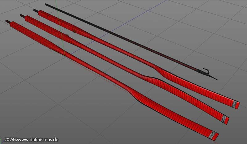 Hier ist die Formgebung noch differenzierter: runde Nock, rechteckiger Griff, elliptischer Schaft und das geschwungene Blatt. Hier sind zeitgenössische Modelle viel entspannter im Knick, weswegen ich diesen dann auch nicht so ectrem wie bei Steel ausgeformt habe. Diese Riemen haben am Blatt eine Verstärkung gegen Splittern, in den zeitgenössischen Modellen meist als Ring ausgebildet und nicht über die untere Kante wie bei Steel.
