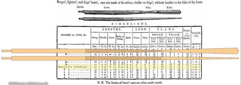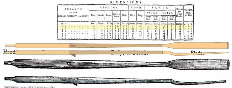 Zum Glück erhielt ich einen Hinweis auf die zeitgenössischen Unterlagen von David Steel, da ich weder Größe noch Form im Gefühl hatte. Die für mich relevanten Größen waren die Sweeps für die größeren Arbeitsboote mit geraden Blättern und die Oars mit gebogenen Blätter für die kleinere Boote.