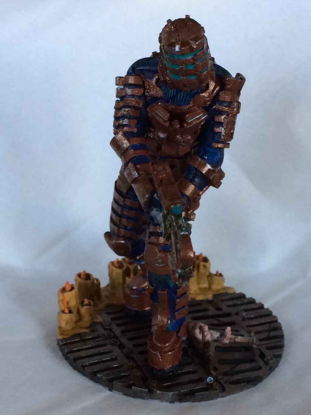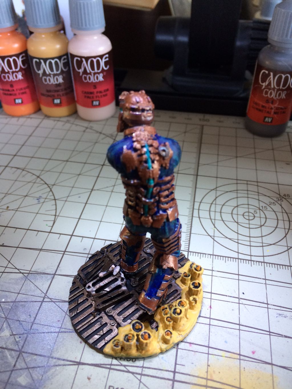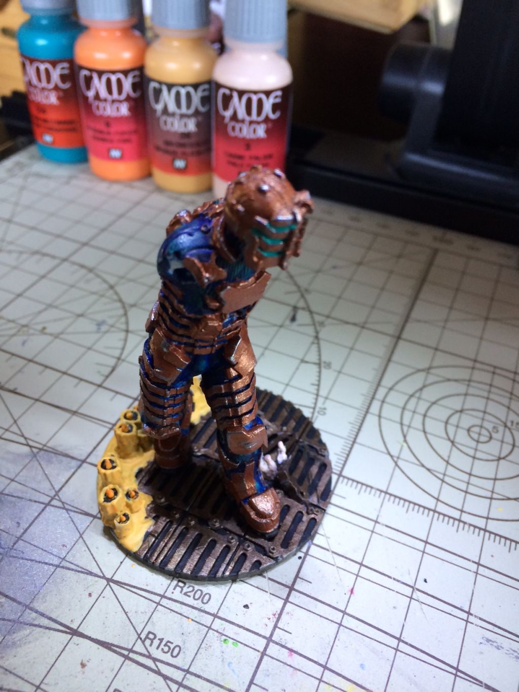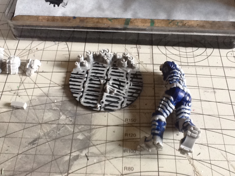 Die Figur wurde zusammengesetzt und es wurden noch Kanten und ein wenig die Einkerbungen bearbeitet. Dann wurden noch die Teile mit Inks und Washes von Vallejo behandelt, um ein wenig den Glanzgrad zu mindern. Ich lege die Figur jetzt erst einmal zur Seite und schaue dann mit ein wenig Abstand darüber, dann entscheide ich ob sie fertig ist, damit ich sie anschließend auf der Base fixieren kann. Letztendlich ist es meine Interpretation des Charakters aus Dead Space.