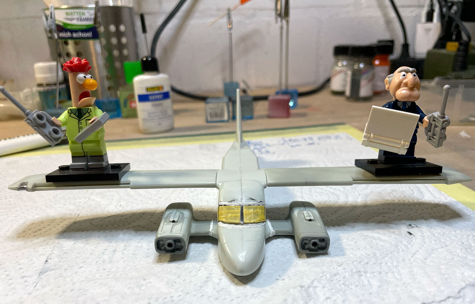 Die Tragflächen des alten Kits schreien nach rausbrechen beim Verarbeiten, es geht nur sehr wenig Material in den Rumpf und die Hebelkraft muss gänzlich vom am Rumpf anliegenden Querschnitt der Flächen gehalten werden. Würde mir garantiert abbrechen. Daher hat hier eine alte, krumme Airbrush-Nadel ein zweites Leben als Flächenholm bekommen. Bombenstabil, wie die Muppets beweisen ;)