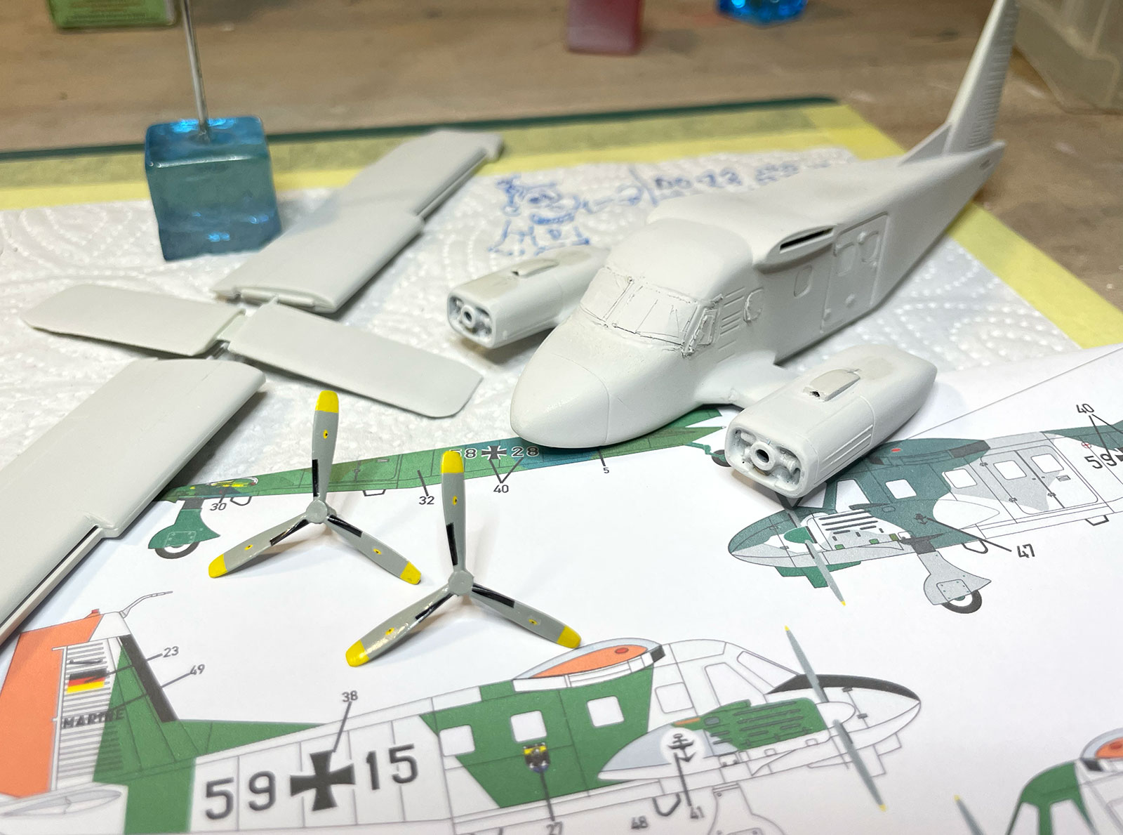Meine Do-28 nähert sich der Lackierung. Ein Landelicht habe ich "gescratcht", Teil der Tragfläche rausgesägt, das Klarsichteil aus einer PET-Flasche um einen Zahnstocher mit Feuerzeugwärme gebogen. Das dritte Teil war dann nicht mehr a) über den Punkt geschmolzen b) unauffindbar mit dem Kellerboden verschmolzen c) zu klein runtergepfeilt...