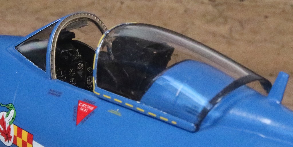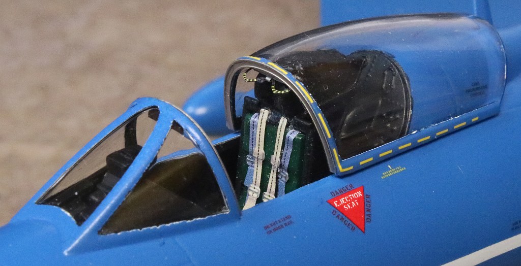 Diese hat es jetzt! Entstanden ist das Modell aus dem Airfix-Bausatz, ergänzt mit dem von Cartograf gedruckten und damit hervorragenden Decalsatz des Italeri-Bausatzes, und zusätzlich kamen Eduard-Ätzteile für das Cockpit und den Pilotensitz sowie Abdeckmasken für die Verglasung ebenfalls von Eduard zum Einsatz. Weiterhin noch eine Stecknadel als Pitotrohr an der linken Flügelspitze. Die blaue Farbe ist von Tamiya, nach Augenmaß selbst zusammengemischt, zumal der richtige Farbton imho sowieso Glücksache ist, da halbwegs farbechte Aufnahmen aus der damaligen Zeit ohnehin kaum zu finden sind. Klar ist eigentlich nur, dass der Blauton deutlich heller ist als das Blau der RAF-Kokarden.