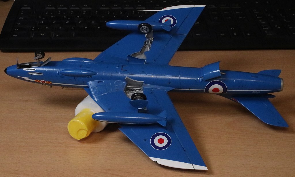 Andererseits habe ich nunmal eine gewisse Vorliebe für bunte Vögel und Display-Teams, daher ist es dann doch eine britische Hunter in der Farben der "Blue Diamonds" geworden. Vor der Etablierung der "Red Arrows" als permanente Kunstflugstaffel der Royal Air Force wurden einzelne Staffeln der RAF für ein paar Jahre damit beautragt, diese Funktion so eher nebenbei wahrzunehmen, und so gab es dann die "Black Arrows" mit der Hunter, eben die "Blue Diamonds" ebenfalls mit der Hunter und mit 16 (!) Maschinen im Formationskunstflug, oder auch die "Yellowjacks" mit der Gnat, wobei dieses Muster dann auch ab 1964 als Erstausstattung der "Red Arrows" diente. Diese habe auch noch live gesehen - bin alt genug dafür! - und auch schon mal gebaut, und vielleicht brauchte dieses Modell auch einfach passende und angemessene Gesellschaft. :3: