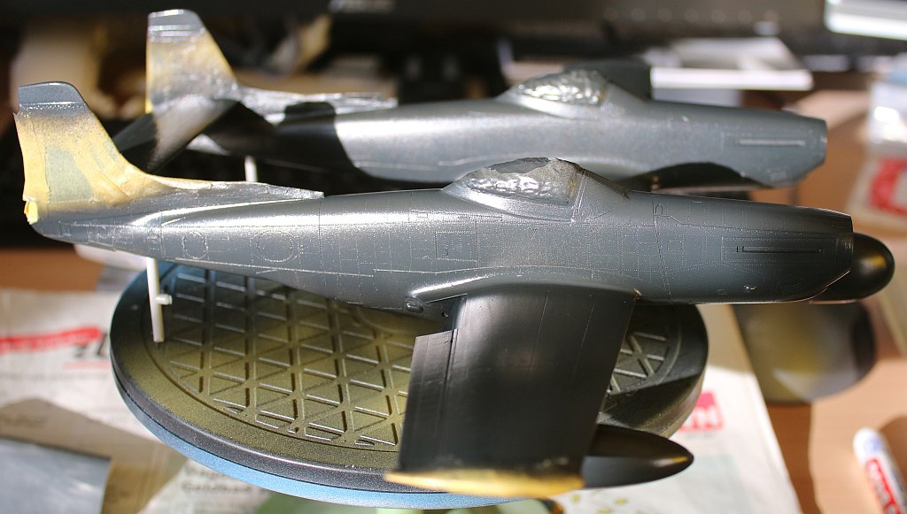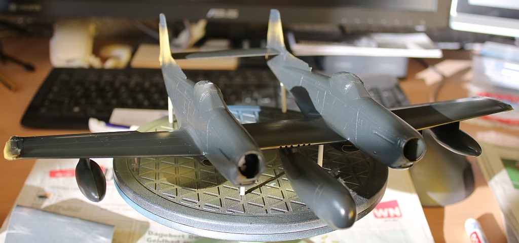 Mit Ausnahme einer leichten Betonung der Steuerflächen habe ich auf ein Washing weitgehend verzichtet, da ich trotz grundsätzlich guter Passung doch einige Gravuren beim Spachteln und Schleifen eliminiert habe, was dann bei einem Washing zu einem uneinheitlichen Ergebnis geführt hätte.