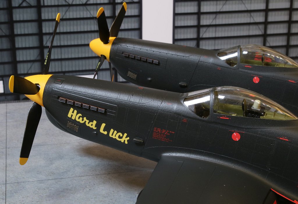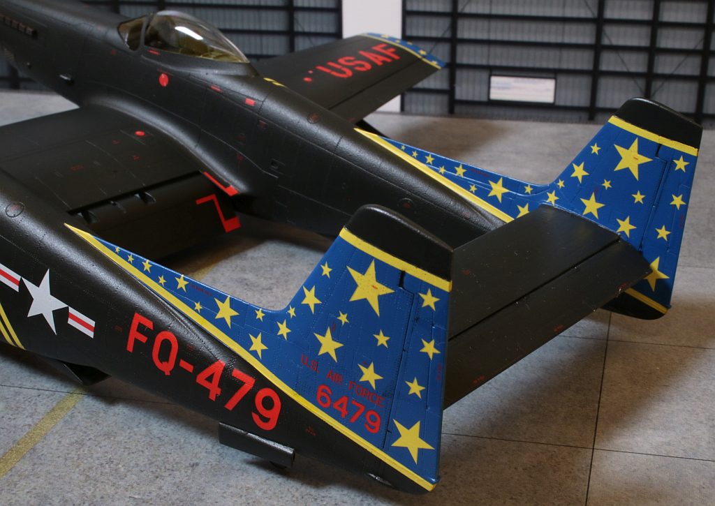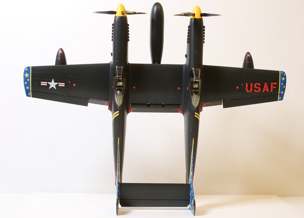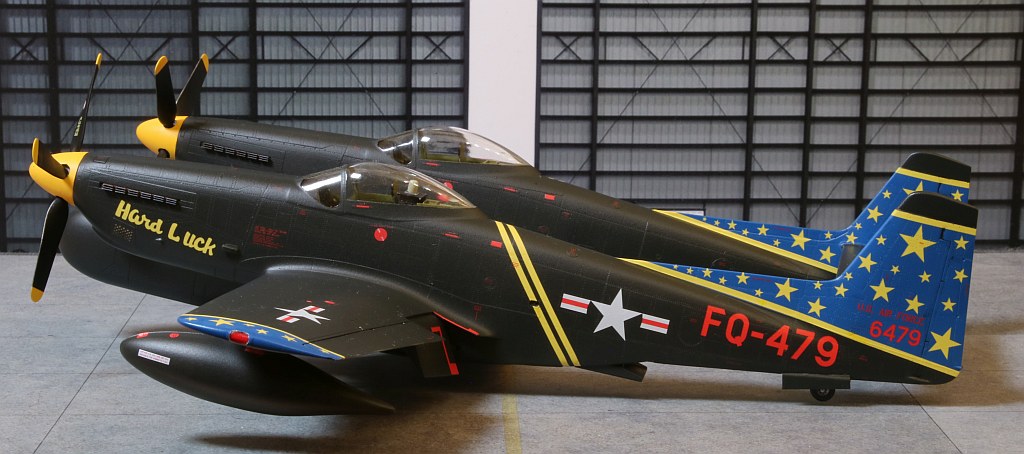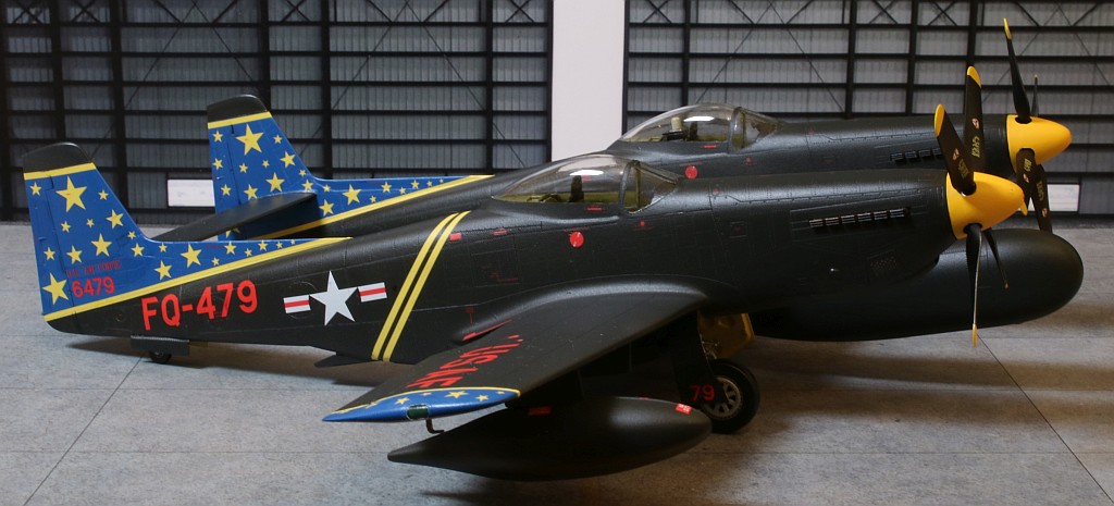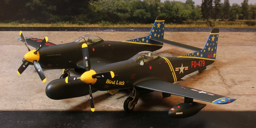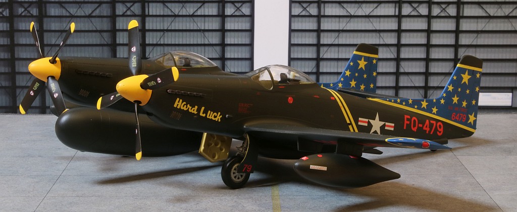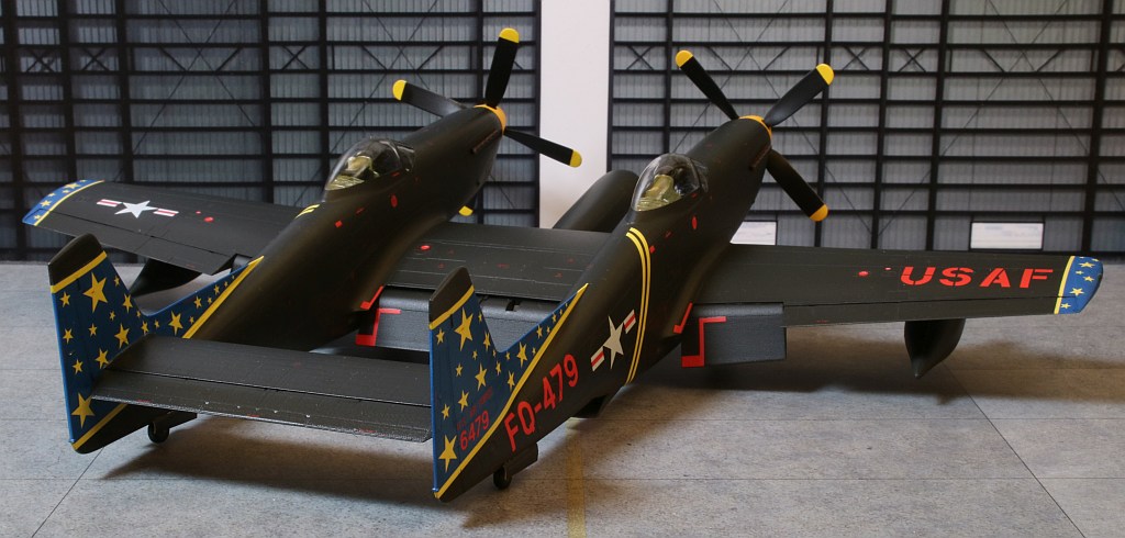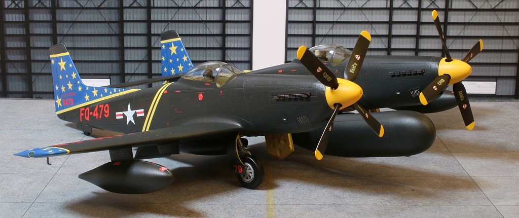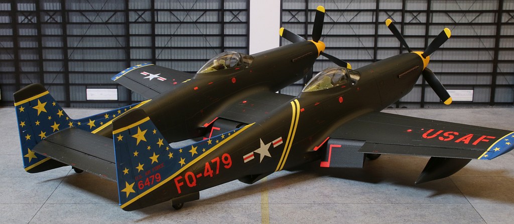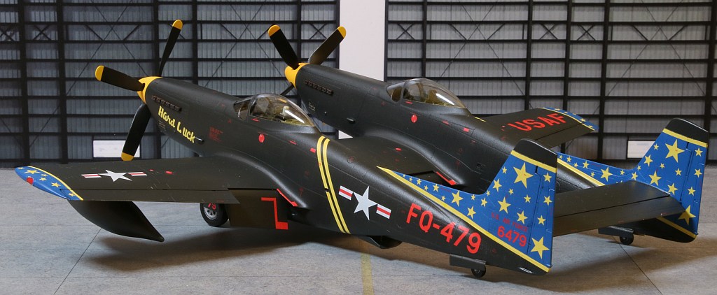 Nach ungefähr 6 Wochen Bauzeit ist mein nächstes Modell fertig geworden: Eine Twin Mustang in der Nachtjägerversion, also eine North American F-82F in den Farben des einzigen Betreibers, der US Air Force, wobei ich natürlich an der recht farbenfrohen Variante eines eigentlich schwarz lackierten Flugzeuges nicht vorbeigekommen bin. :6: