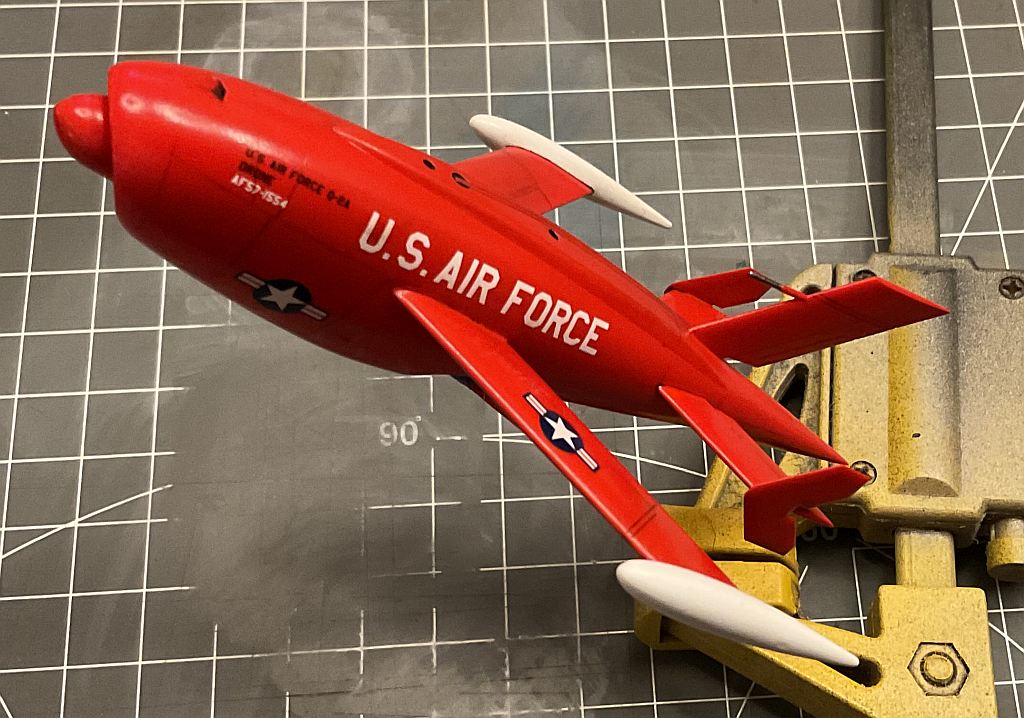 Meine aktuelle Vorliebe für ukrainische Hersteller hat mir nach ungefähr zwei Wochen Bauzeit - und das dürfte persönlicher Rekord sein - ein weiteres fertiges Modell beschert. Es handelt sich um eine Ryan BQM-34A Firebee, eine Zieldarstellungsdrohne, hier in der Ausführung der US Navy. Natürlich in meinem Lieblingsmaßstab 1:48, um einen stimmigen Farbtupfer in meiner Vitrine darstellen zu können.